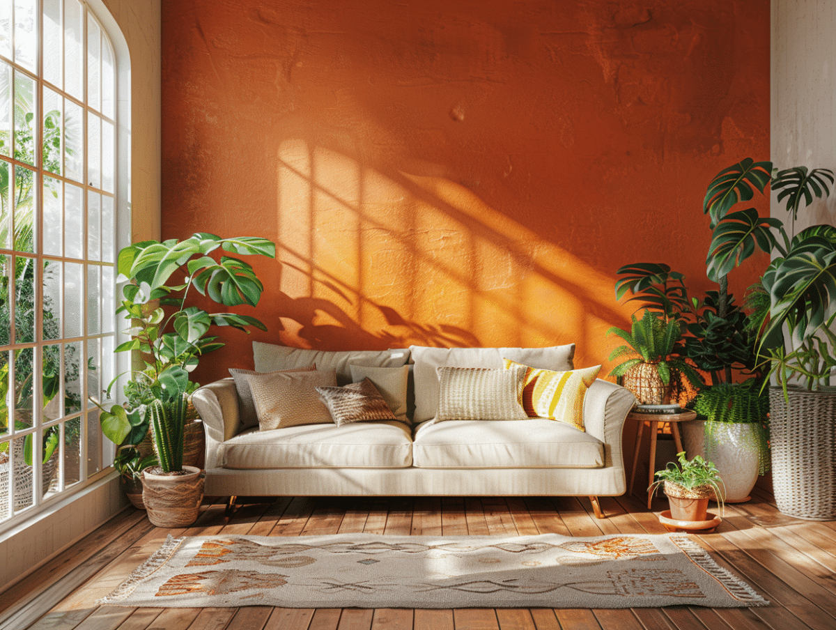 La terracotta trouve une place de choix dans le salon et la chambre, où elle apporte convivialité et chaleur. Pour un salon accueillant, peignez un mur d’accent en terracotta et associez-le à des textiles comme des coussins et des plaids dans des tons neutres. Dans la chambre, optez pour des rideaux ou un couvre-lit en terracotta pour un effet cocooning.