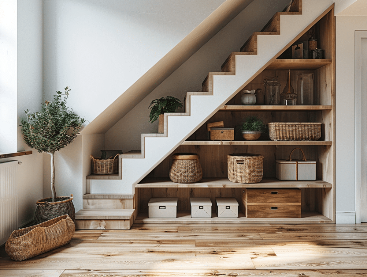 L’espace sous escalier ne demande qu’à être exploité pour devenir un atout majeur de votre intérieur, alliant praticité et esthétisme.